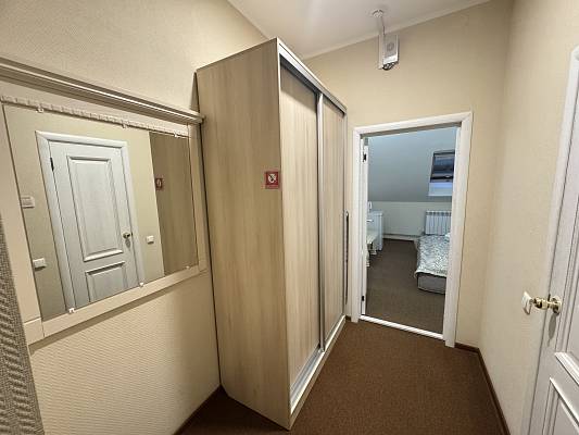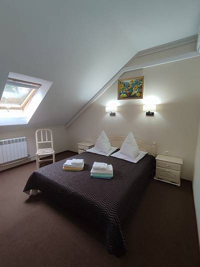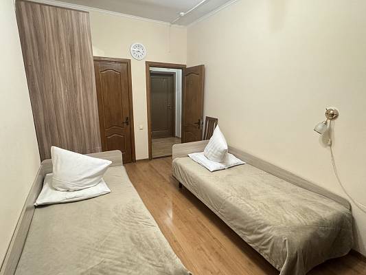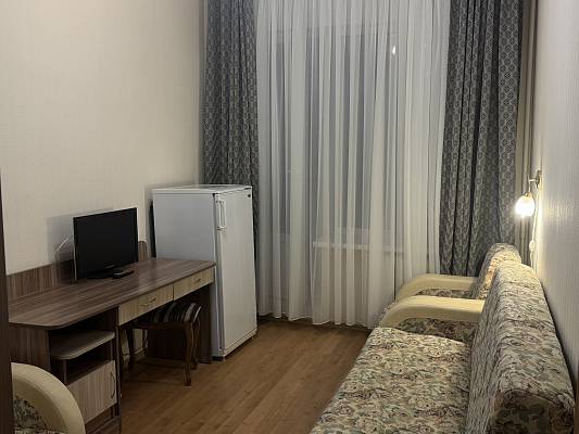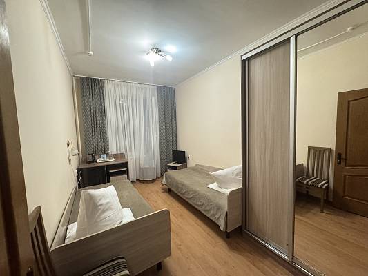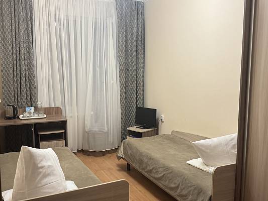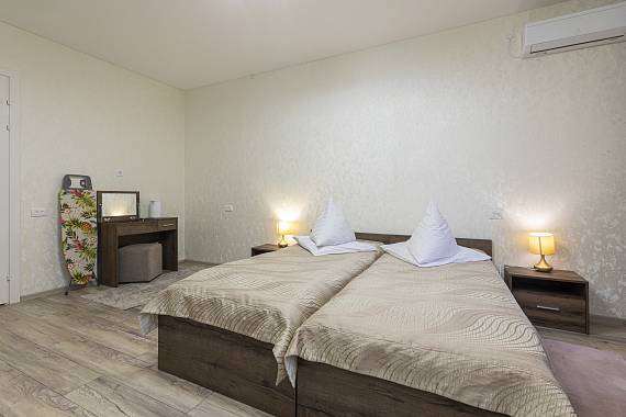 В номере: 2 односпальные кровати, шкаф, стол, набор посуды, тумбочки, стулья, телевизор, холодильник, санузел, душ, без балкона.