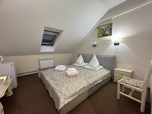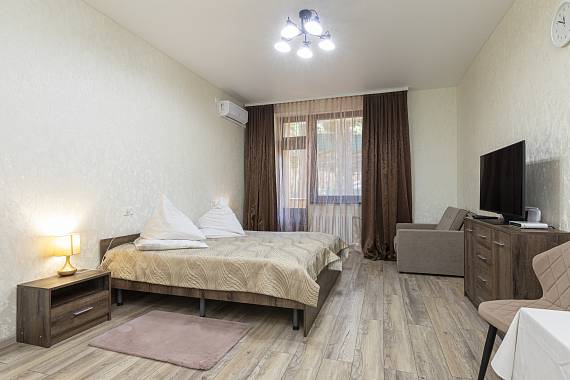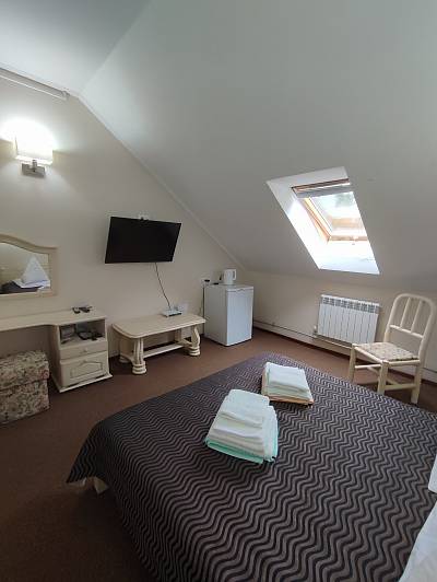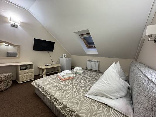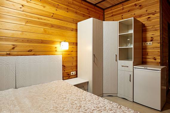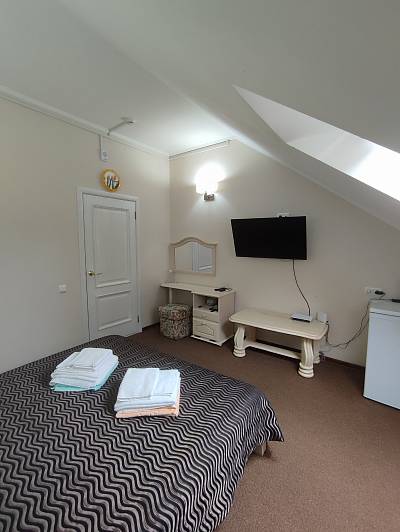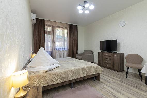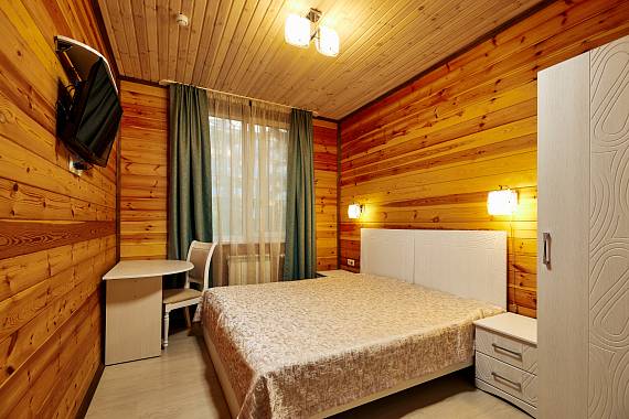 В номере: двуспальная кровать, диван (кресло), шкаф, стол, тумбочки, стул, набор посуды, телевизор, холодильник, санузел, ванна, фен.