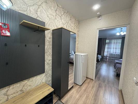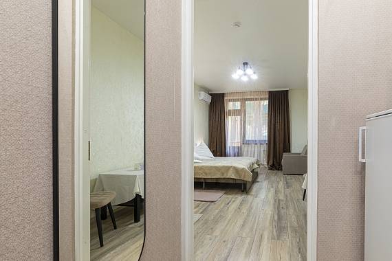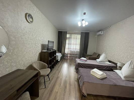 В номере: 2 односпальные кровати, шкаф, набор посуды, тумбочки, стулья, телевизор, холодильник, санузел, душ, балкон.