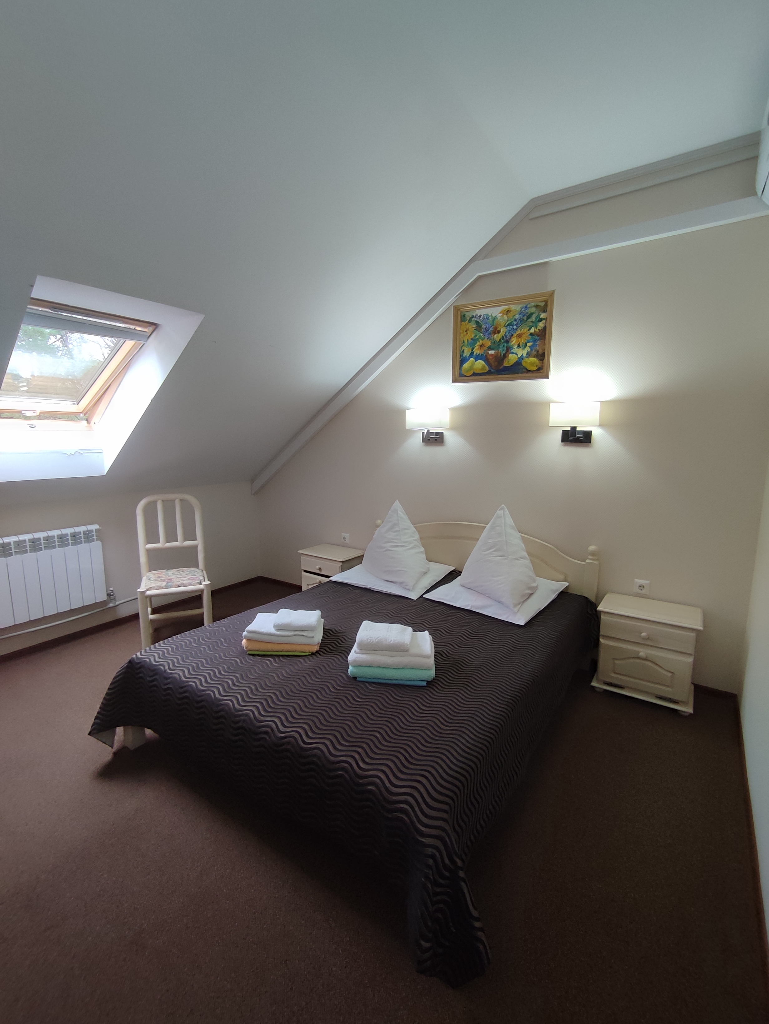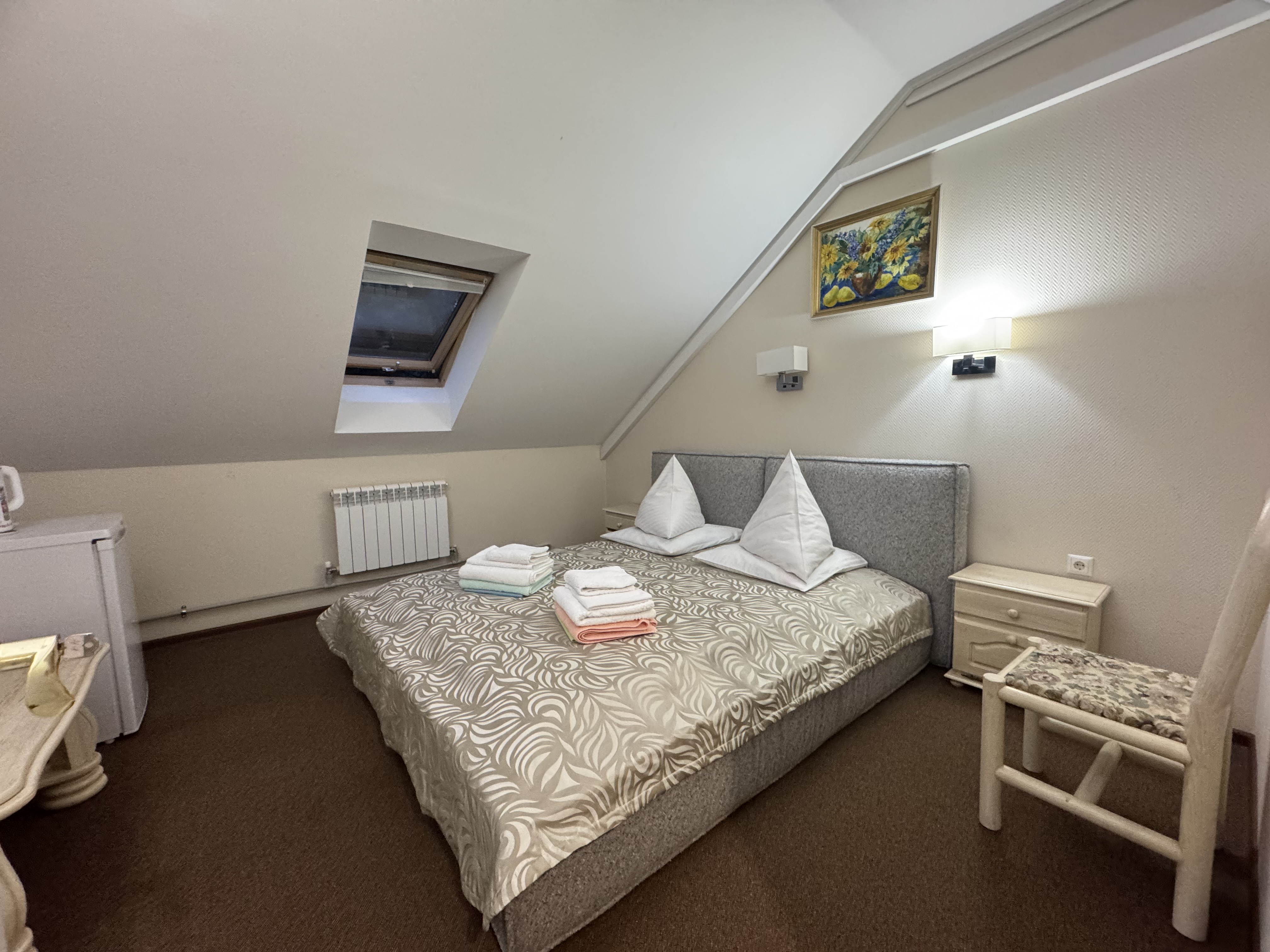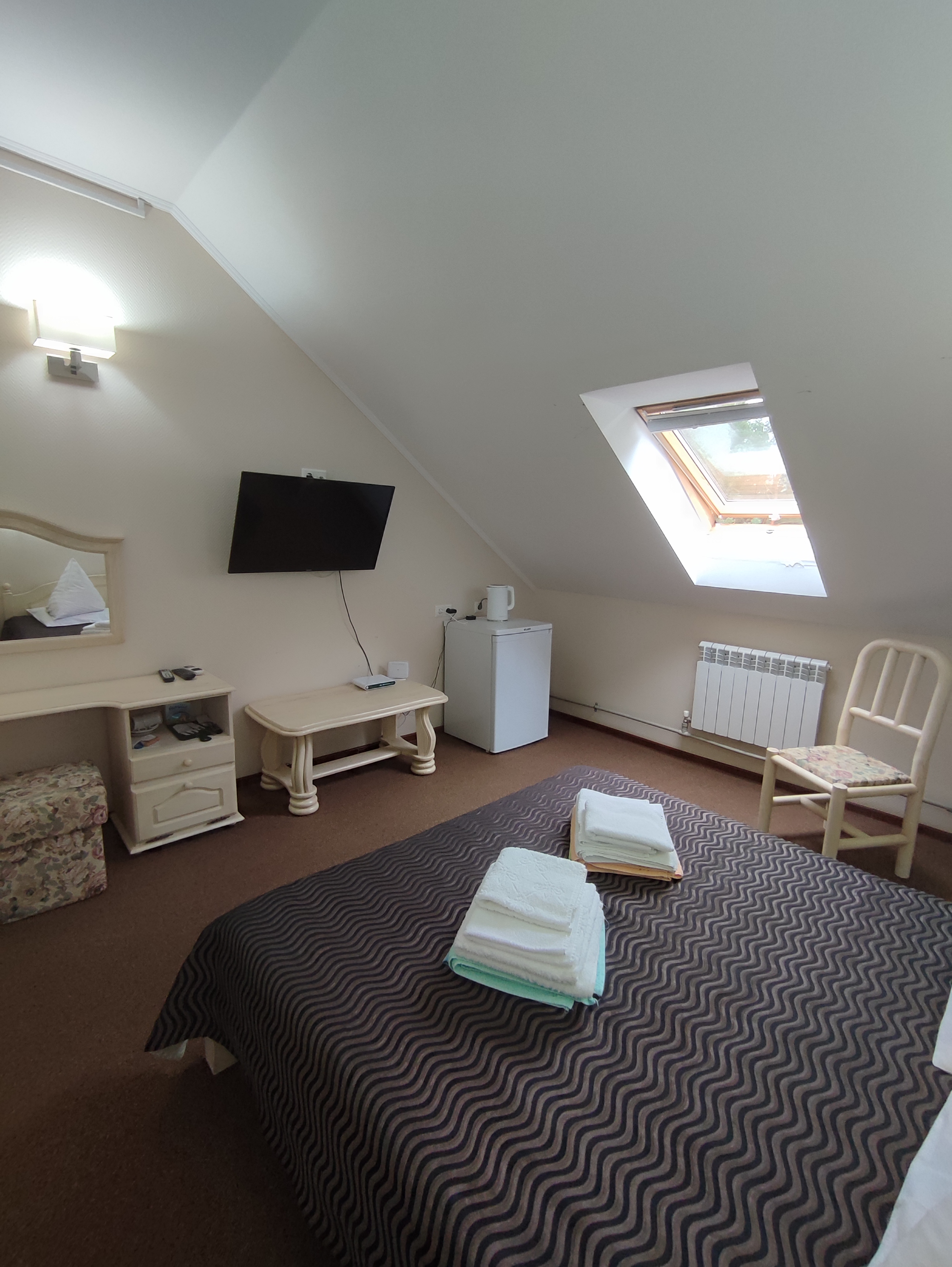 В номере: двуспальная кровать, прикроватная тумба, журнальный столик, туалетный столик, шкаф, стулья, телевизор, чайник, холодильник, столовые приборы и посуда, фен, сушилка для белья, гладильная доска, утюг, сейф, Wi‑Fi