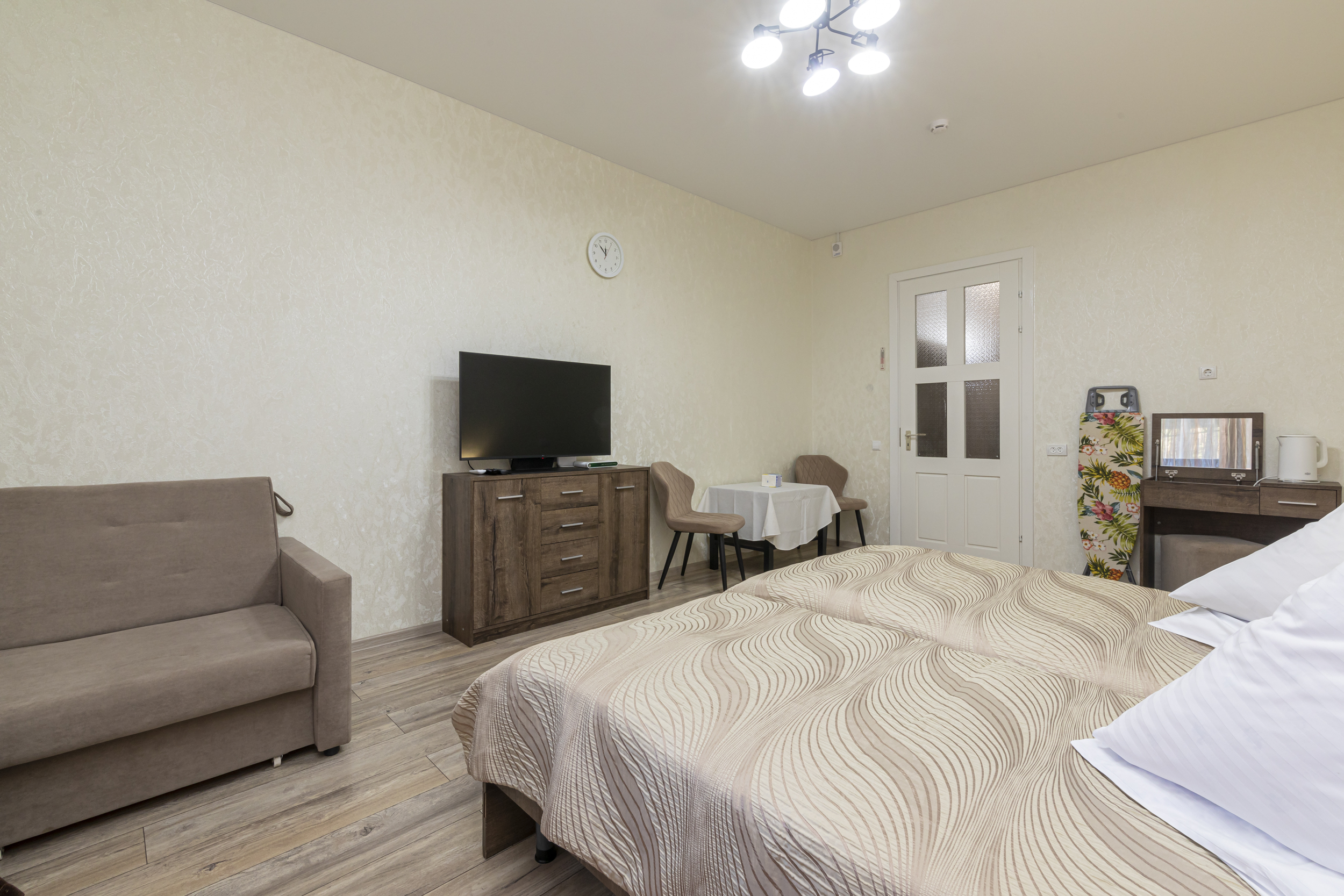 В номере: Две раздельные кровати, кресло-кровать, прикроватная тумба, журнальный столик, туалетный столик, шкаф, стулья, телевизор, чайник, холодильник, столовые приборы и посуда, фен, сушилка для белья, гладильная доска, утюг, сейф, халат, тапочки, Wi‑Fi, балкон